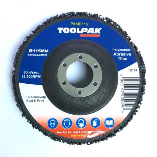 ø115mm x 22.23mm bore polyamide abrasive disc. For surface preparation and cleaning of almost any material. Ideal for removing rust and scale, paint, varnish, graffiti, light weld-spatter. For use on 115mm hand held angle grinders. A versatile polyamide abrasive pad is permanently secured to a depressed centre fibreglass-reinforced bonded backing disc. Features include no surface damage, no clogging of the disc.