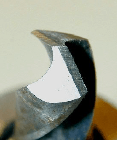 - Use of Grinders A grinder is useful to initially grind and shape the drill in preparation for final sharpening, The preferred method for final sharpening of drills for use with hard metals is the abrasive moving off the cutting edge of the drill bit. A grinder only allows the drill to be sharpened with the abrasive coming onto the cutting edge. In addition the abrasive on a fine grind wheel is still too coarse for finishing and pro-duces a serrated cutting edge, this is undesirable as the cutting edge will cut unevenly producing : more heat , as the peaks of the cutting edge will wear before the dips, will need re-sharpening more often . The swarf will not spiral off the drill and workpiece as desired. see picture .